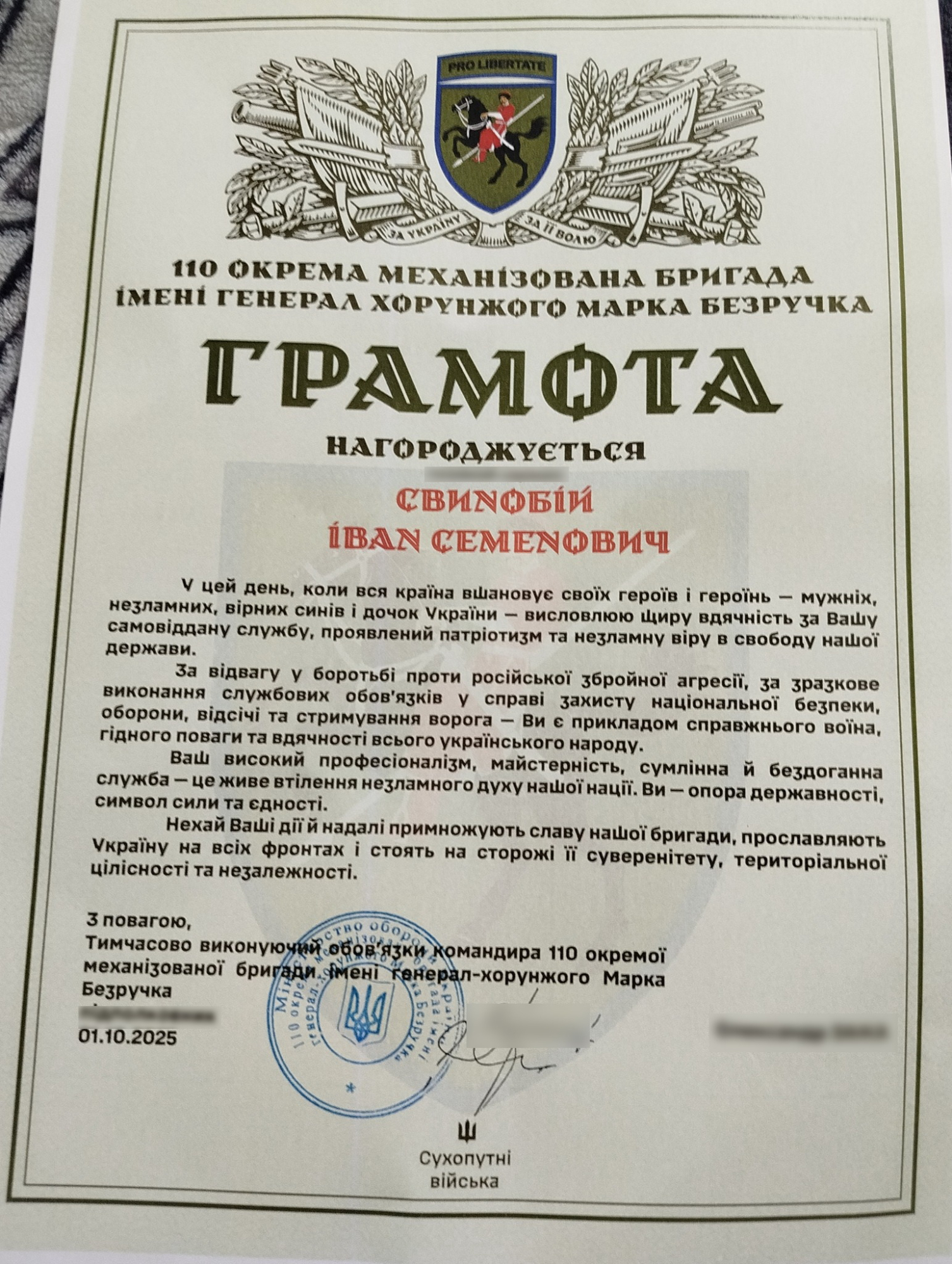 Також Івана Семеновича відзначено грамотою від командування 110 окремої механізованої бригади імені генерал-хорунжого Марка Безручка.