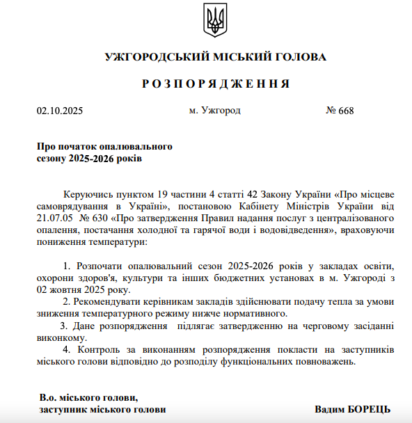 В Ужгороді ще 2 жовтня ввімкнули опалення. Про це відомо з розпорядження міського голови Ужгорода від 2.10.25 про початок опалювального сезону.