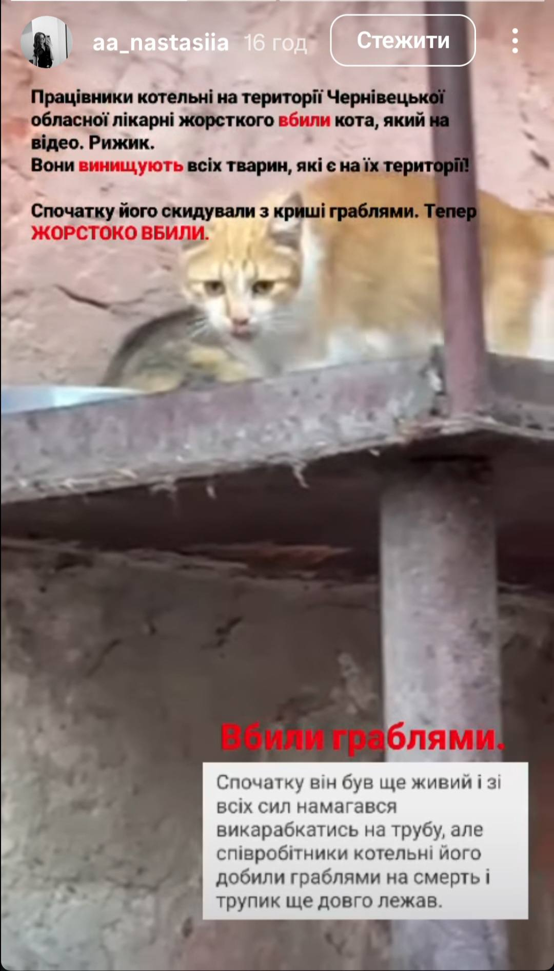 Вони граблями вбили цього рудого котика! Його труп ще довго там лежав! Адміністрація теж потурає цій жорстокості! Там регулярно труять тварин!