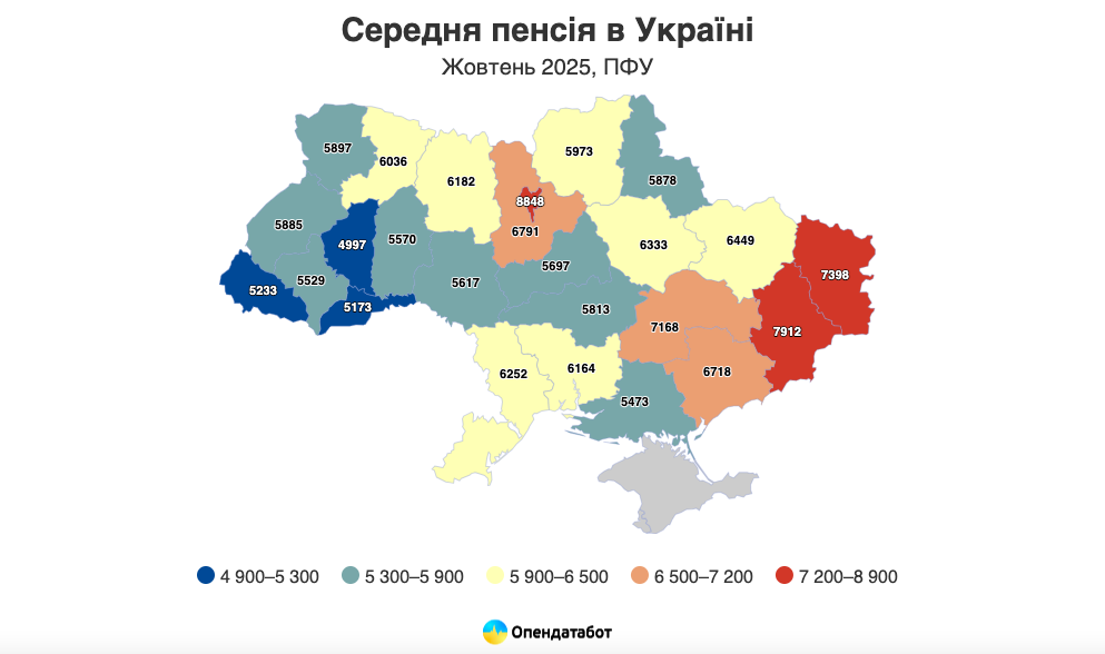 Згідно зі статистичними даними аналітичного ресурсу Опендатабот, середня пенсія у Чернівецькій області становить 5173 гривні. Менші виплати отримують лише пенсіонери Тернопільської області, там середня пенсія 4997 гривень.