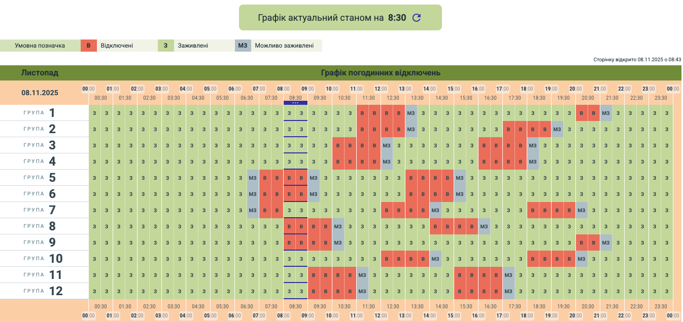 Опубліковано оновлений графік обмежень електропостачання в Чернівцях та області на 8 листопада.