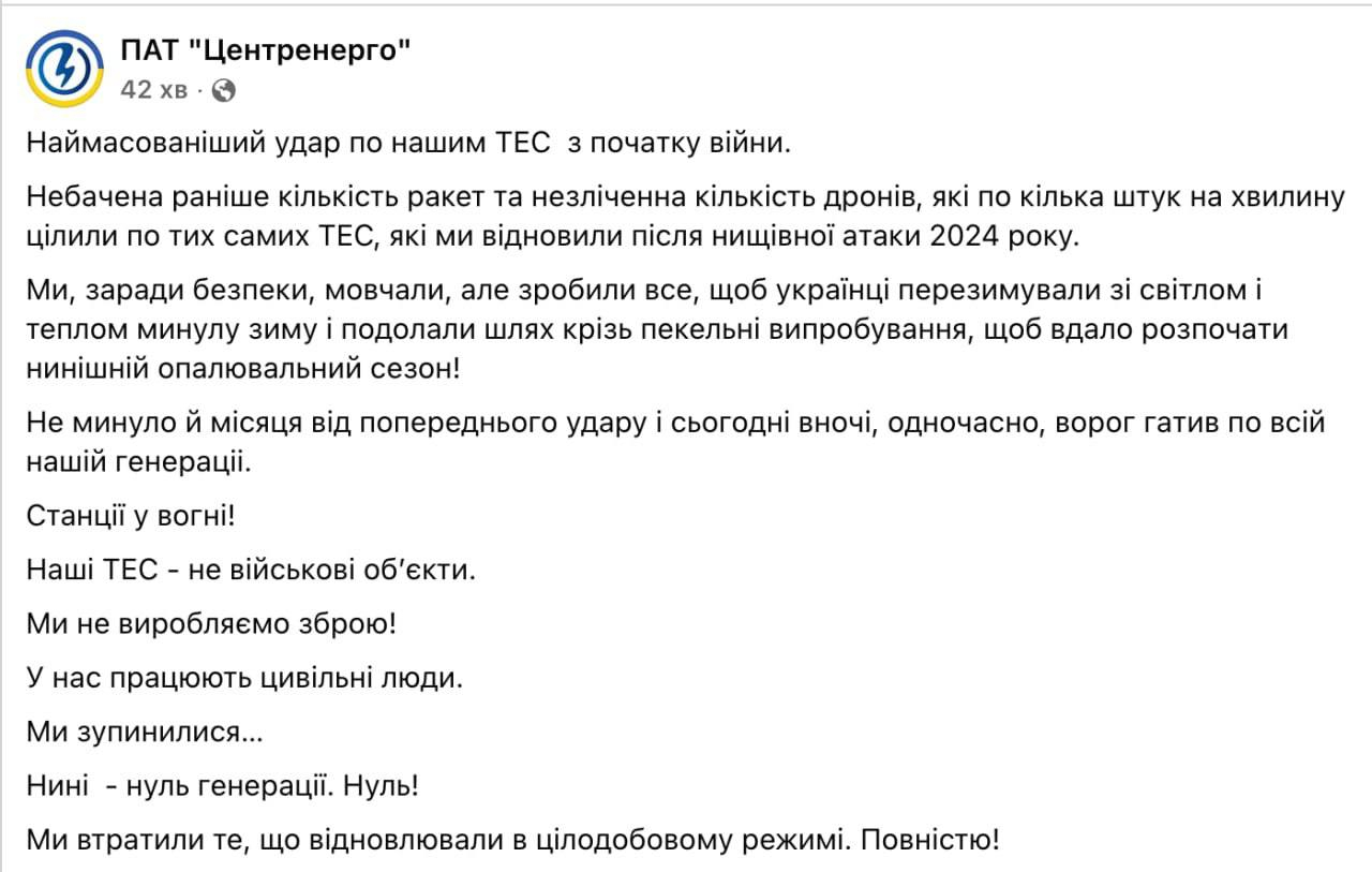 «Ми зупинилися… Нині – нуль генерації. Нуль! Ми втратили те, що відновлювали в цілодобовому режимі. Повністю!», – повідомили у пресслужбі «Центренерго».