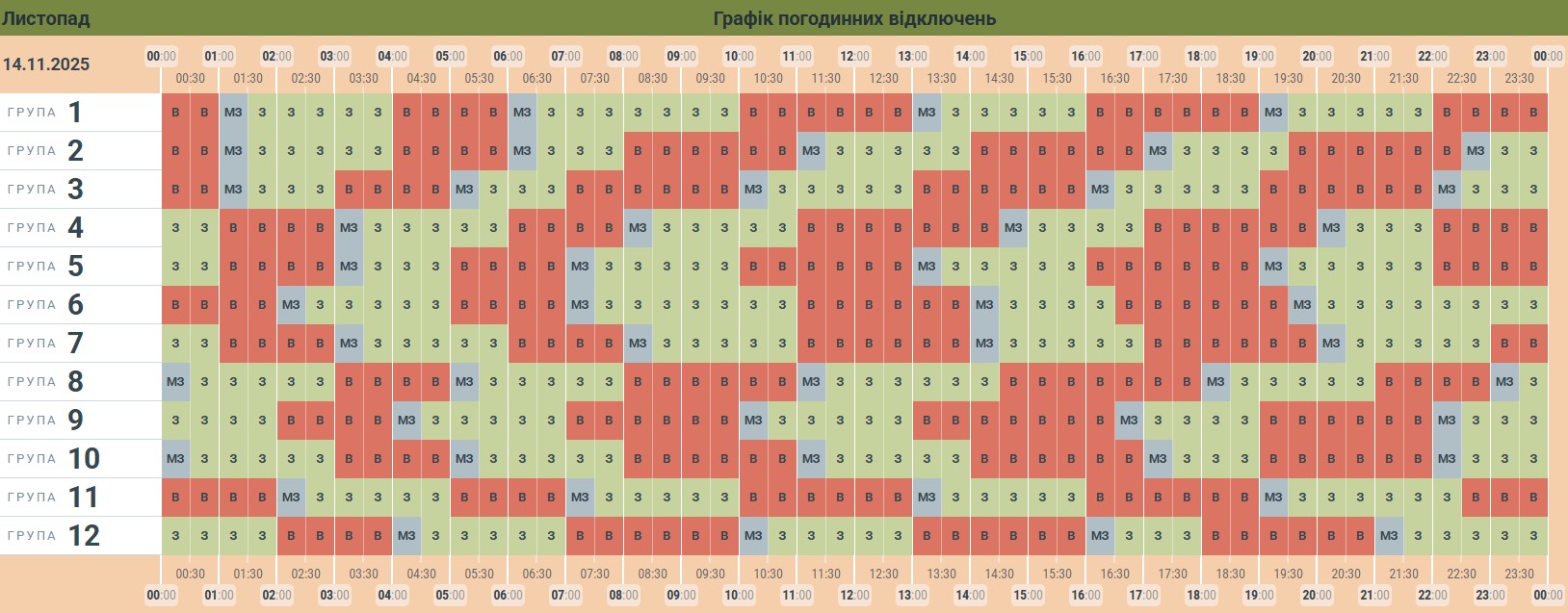 «Чернівціобленерго опублікувало графік погодинних відключень світла на п’ятницю, 14 листопада. Порівняно з попереднім днем відключень стане ще більше. Світла не буде в різних групах споживачів від 10 до 14,5 годин на добу.