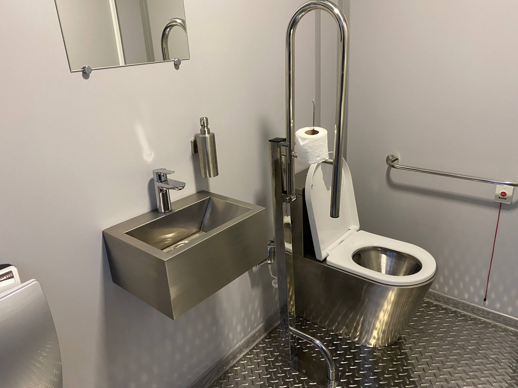 Для людей з інвалідністю передбачили пандус та окрему інклюзивну кабіну, яка також обладнана сповивальним столиком для малюків.
