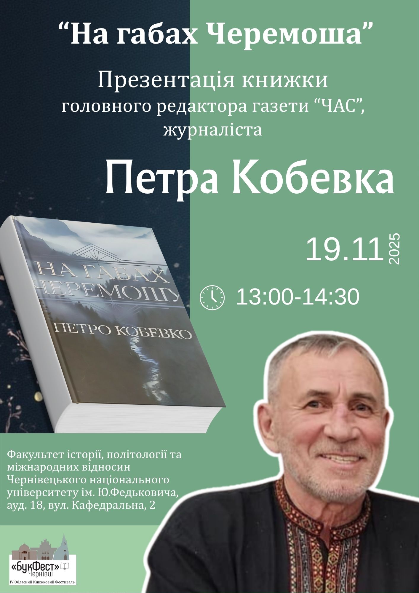 19 листопада о 13:00 у Чернівцях відбудеться презентація книжки головного редактора газети «Час», журналіста Петра Кобевка. Книга знаного на Буковині журналіста має назву «На габах Черемошу».