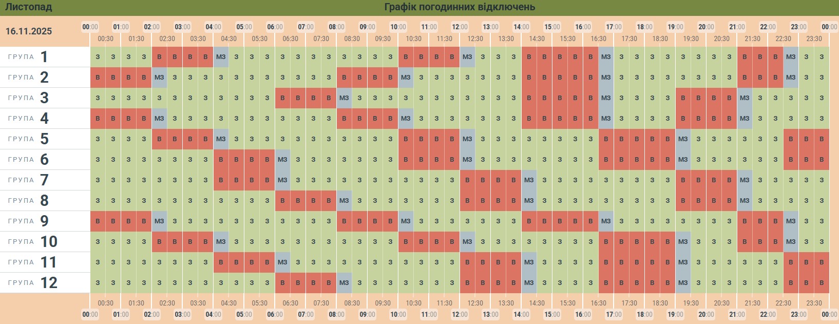 «Чернівціобленерго» опублікувало графік погодинних відключень електроенергії у неділю 16 листопада. Згідно графіка у вихідний на Буковині світло в усіх групах вимикатимуть 4 рази. Загалом світла не буде від 8 до 10 годин за добу.