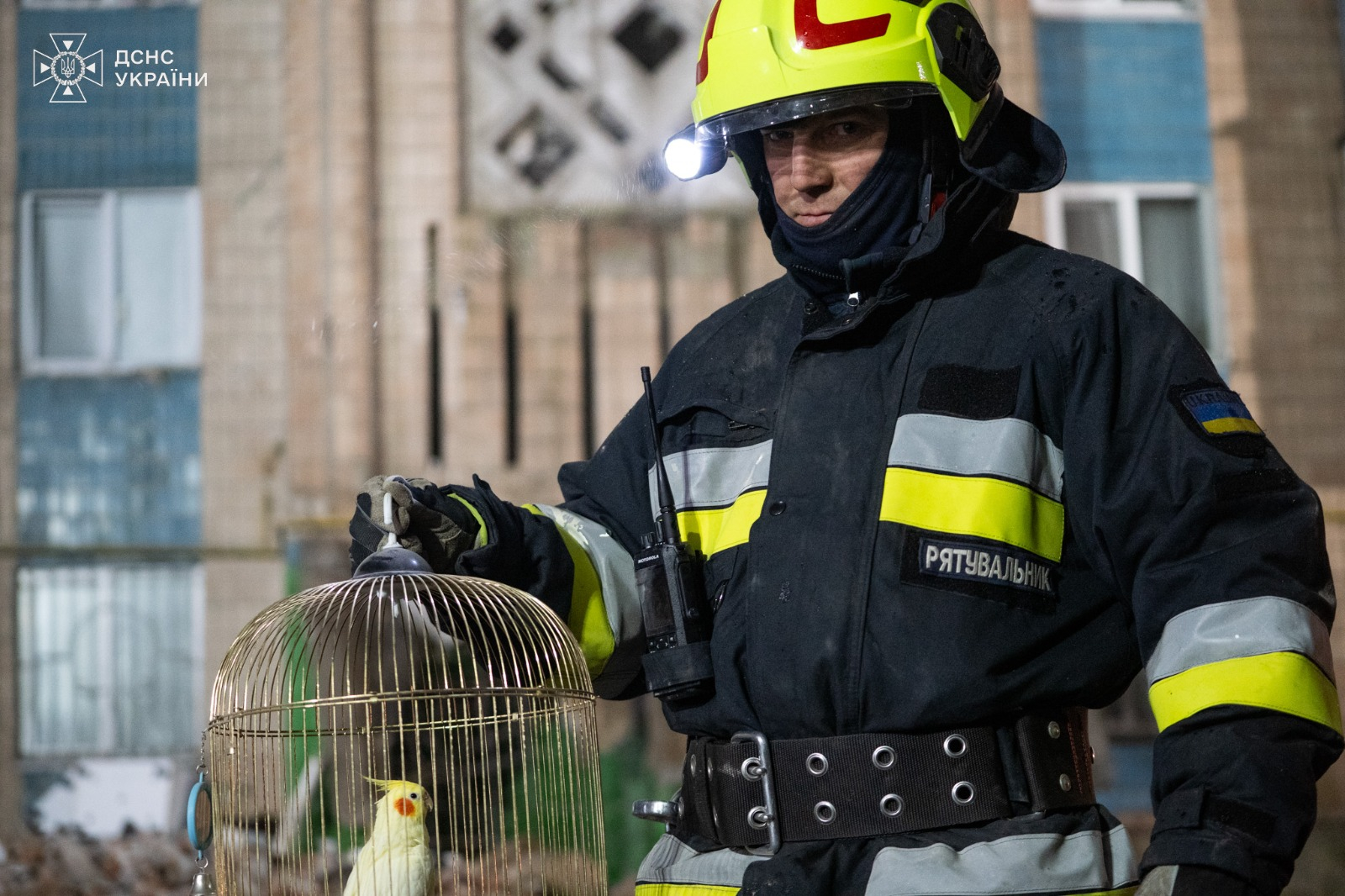 У Тернополі серед руїн та крихких уламків однієї з 9-поверхівок, пошкодженої російською ракетою, рятувальники знайшли папугу.