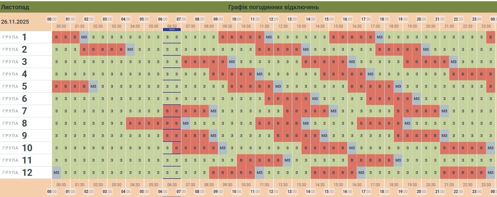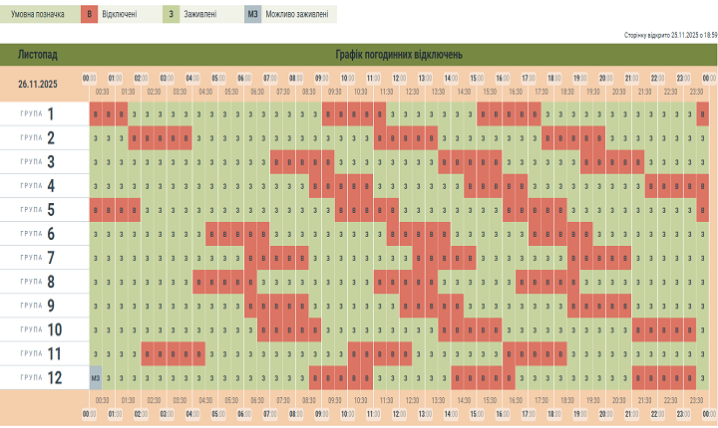 «Чернівціобленерго» опублікувало графік погодинних відключень електроенергії на середу 26 листопада. Сьогодні на Буковині світло вимикатимуть тричі. Загалом світла в оселях буковинців не буде від 5 до 8 годин, в залежності від номеру групи споживачів.