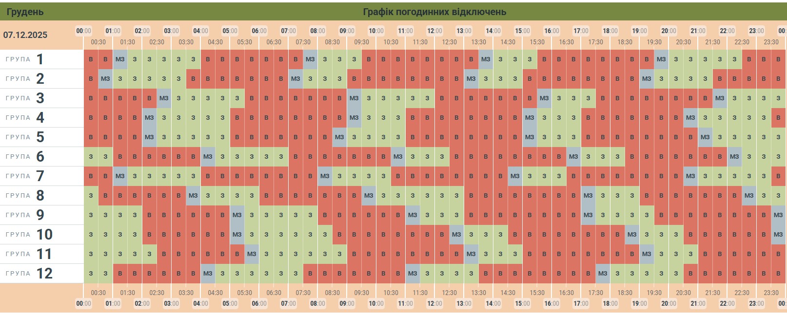 Відключатимуть світло 4 рази на добу, а знеструмлення триватимуть від до 4,5 годин. Світла вдень майже не буде, лише короткі включення двічі по 1,5-2 години.