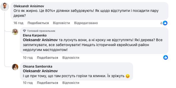 Також дописувачі в коментарях вказують на те, що в проєкті не передбачено збереження дерев та висловлюють сумніви, що нова 5-поверхова будівля "впишеться" в архітектуру мікрорайону з нижчими будинками.