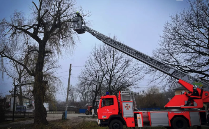 За допомогою автодрабини та спецобладнання надзвичайники безпечно зрізали аварійні дерева та прибрали потенційно небезпечні частини деревини, запобігши можливим надзвичайним подіям.
