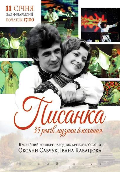 У Чернівцях 11 січня відбудеться ювілейний концерт «35 років музики й кохання» дуету «Писанка». Виступатимуть артисти на сцені Чернівецької обласної філармонії імені Гнатюка. Концерт розпочнеться о 17:00.