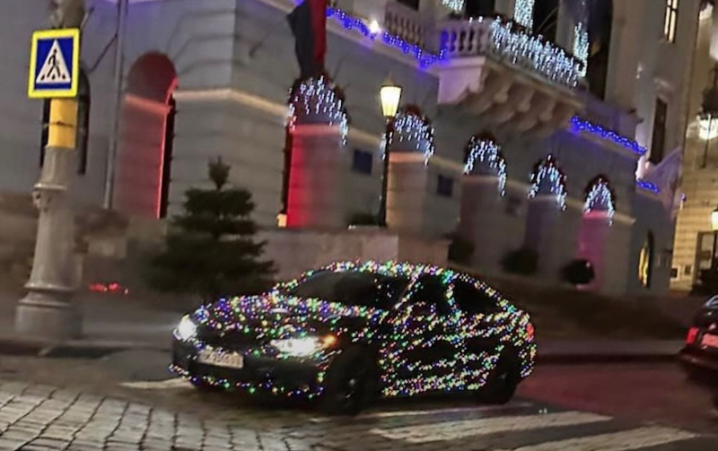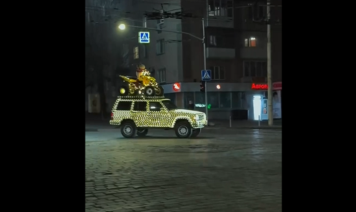 Чернівчани влаштовують новорічний настрій. На проспекті Незалежності помітили джипа прикрашеного гірляндами, на автівку також вмонтували квадроцикл.