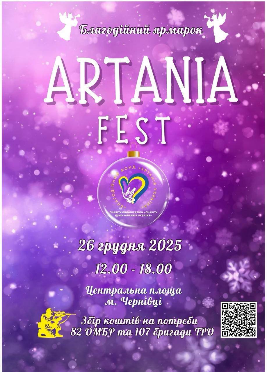 Завтра, 26 грудня, з 12 до 18 години, на Центральній площі у Чернівцях пройде Різдвяний благодійний ярмарок «ARTANIA FEST». Кошти з ярмарку підуть на підтримку 82 ОМБр та 107 бригади ТРО.