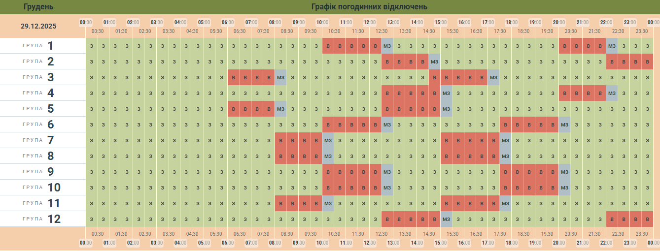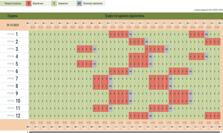 Новий графік вимкнень на Буковині у понеділок, 29 грудня.