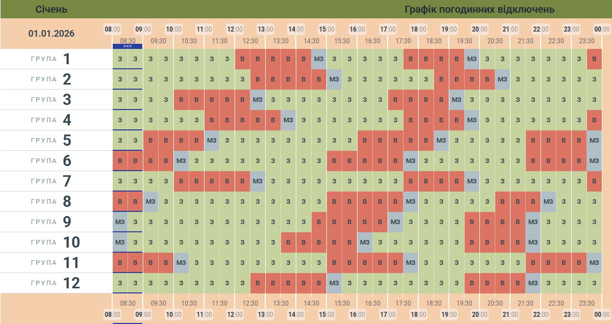 Реклама«Чернівціобленерго» опублікувало оновлений графік погодинних відключень електроенергії у перший день 2026 року. Світло в оселях буковинців вимикатимуть тричі до кінця доби. Загалом без електроенергії буковинцям доведеться провести від 5 до 7 годин.
