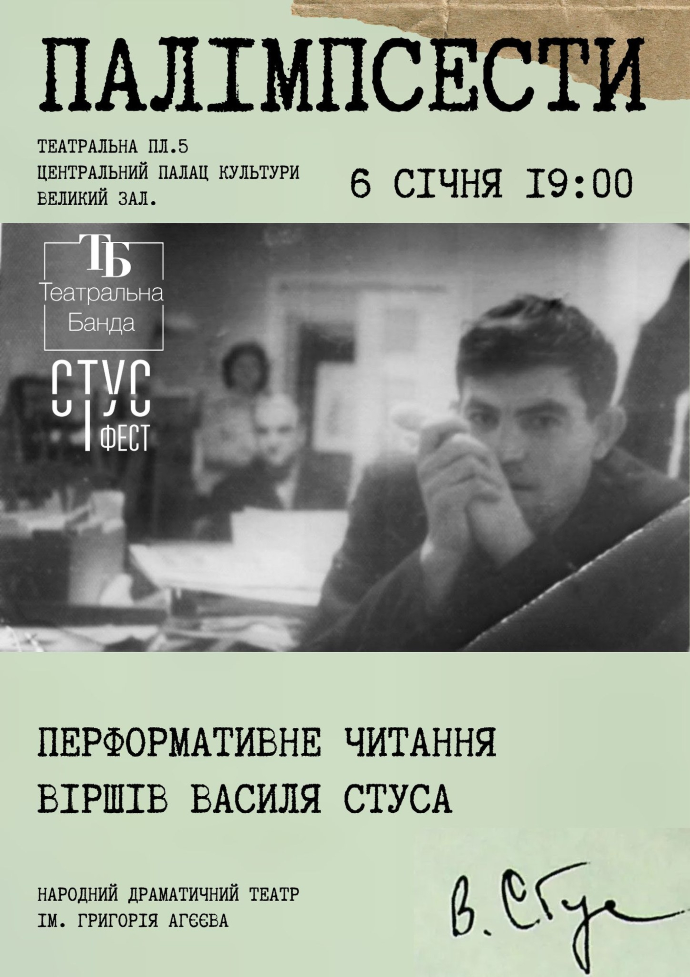 Народний Драматичний Театр ім. Григорія Агєєва представить перформативне читання віршів Василя Стуса "ПАЛІМПСЕСТИ". Режисером читання виступить Іван Данілін.