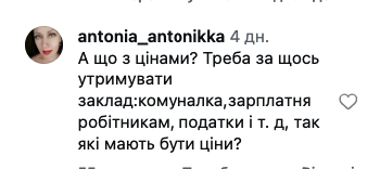 «Ми щойно пішли пообідати українською кухнею і заплатили за це 2 000 гривень. Чому ми за борщ і вареники повинні платити по 500 гривень?» — обурюється жінка.
