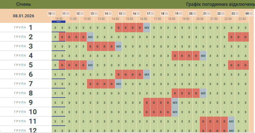 Графік відключень світла у Чернівцях та області на 8 січня.