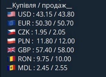Сьогодні, 15 січня, у чернівецьких обмінниках долар купують за 43,15, а продають за 43,80. Європейську валюту продають за 50,70, а купують за 50,30.
