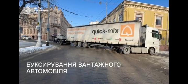 У центрі Чернівців, на розі вулиць Головна та Митрополита Гакмана, застряг вантажний автомобіль з причепом заблокувавши рух транспорту. Рятувальники здійснили буксирування вантажівки розблокувавши рух на дорозі