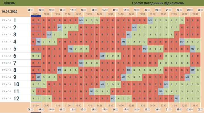 «Чернівціобленерго» опублікувало графік погодинних відключень світла на сьогодні, 16 січня. Світла в оселях буковинців сьогодні майже не буде. Загалом відключення триватимуть до 15 годин на добу, а вдень світло подаватимуть лише один раз на 1,5-2 години.