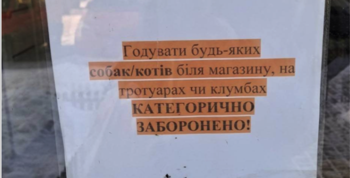 У Чернівцях біля одного з супермаркетів мережі «Нива маркет» з’явилося оголошення із забороною годувати безпритульних собак і котів поблизу закладу, на тротуарах та клумбах.