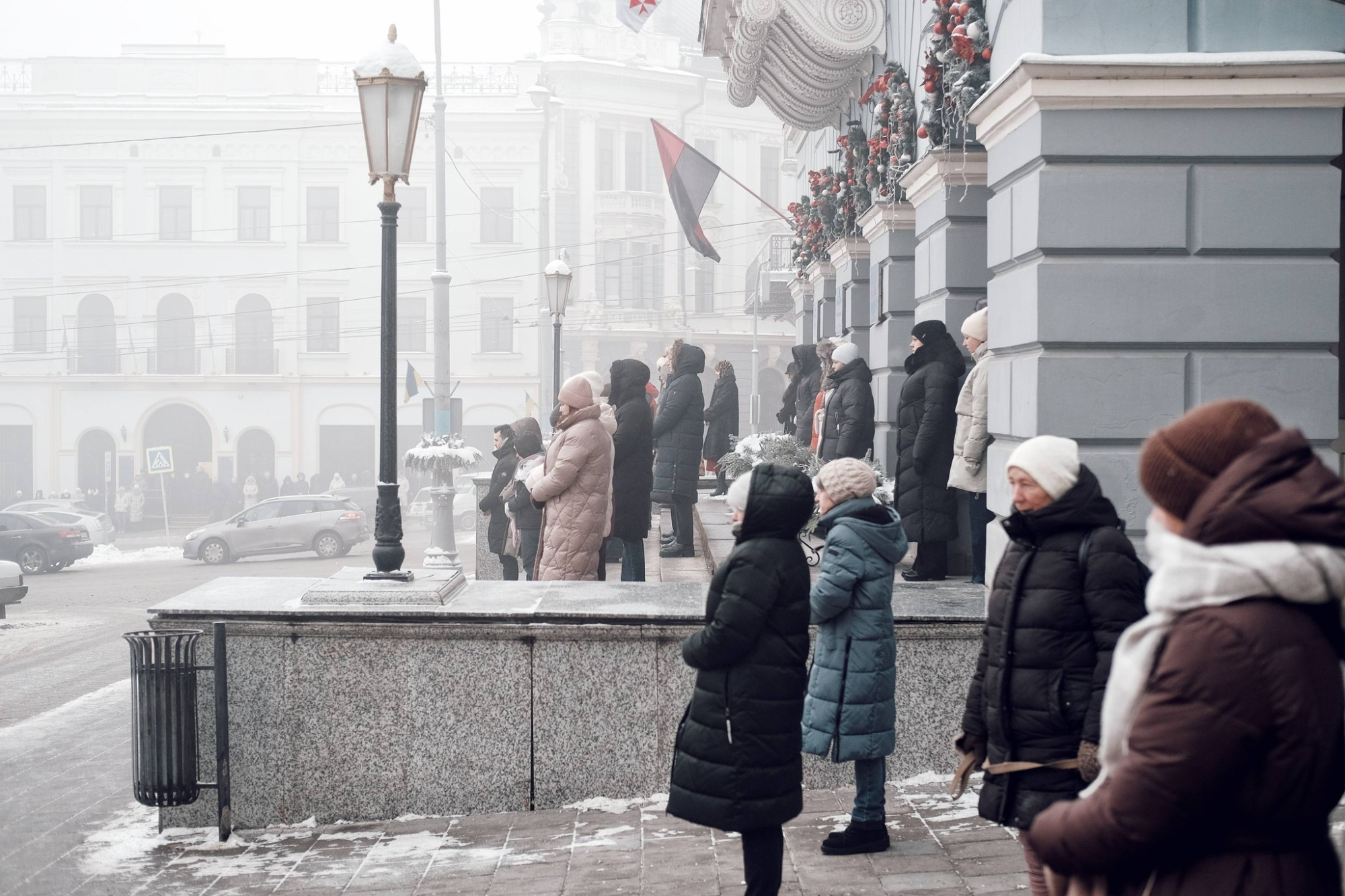 На світлинах - люди вшановують пам'ять загиблих військових та цивільних на російсько-українській війні, поспішають на роботу та чекають на світлофорі, щоб перейти дорогу на пішохідному переході.