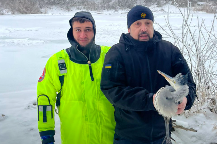 Не залишившись байдужим, чоловік негайно зреагував та викликав рятувальників. Прибувши на місце події, рятувальники у гідрокостюмах, обережно дісталися чаплі по тонкій кризі та змогли безпечно забрати її.