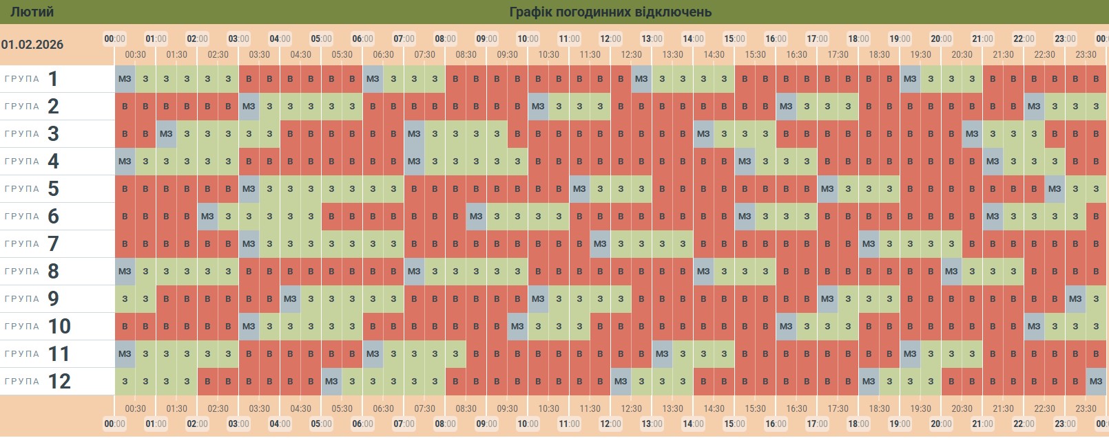 «Чернівціобленерго» опублікувало графік погодинних відключень електроенергії на неділю, 1 лютого. Впродовж доби світло вимикатимуть по 4 рази. Відключення триватимуть від 3 до 4,5 годин. Загалом світла в оселях буковинців не буде до 15 годин.