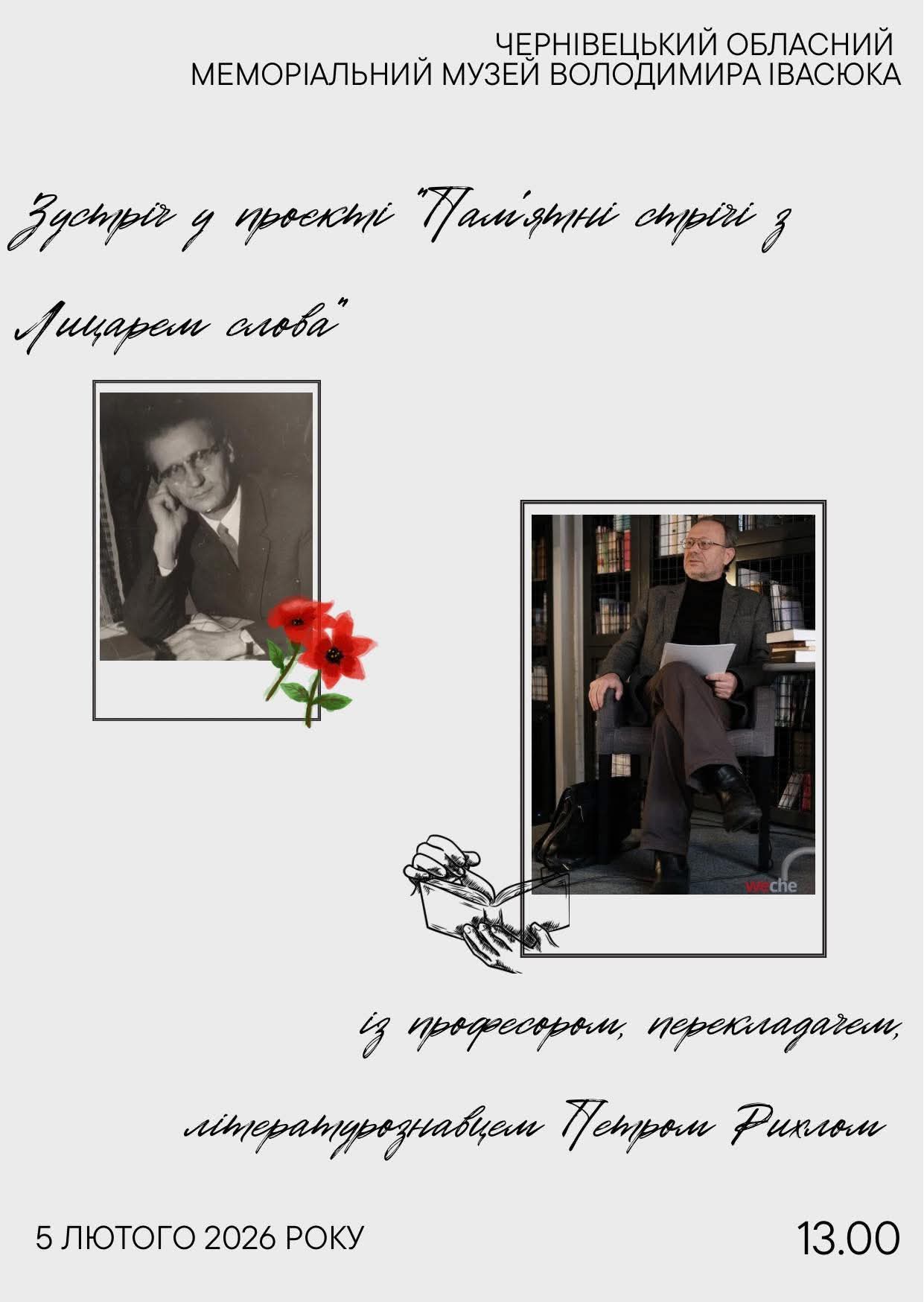 У Чернівцях відбудеться зустріч з професором Чернівецького національного університету імені Юрія Федьковича, перекладачем, літературознавцем Петром Рихлом у рамках проєкту «Пам'ятні стрічі з Лицарем слова».