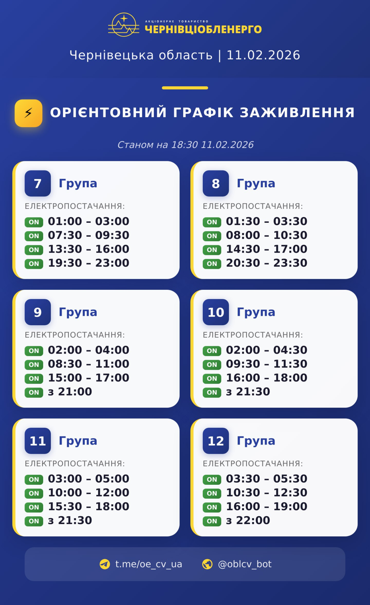 Вчергове оновлений графік вимкнень для Буковини на вечір вечір 11 лютого