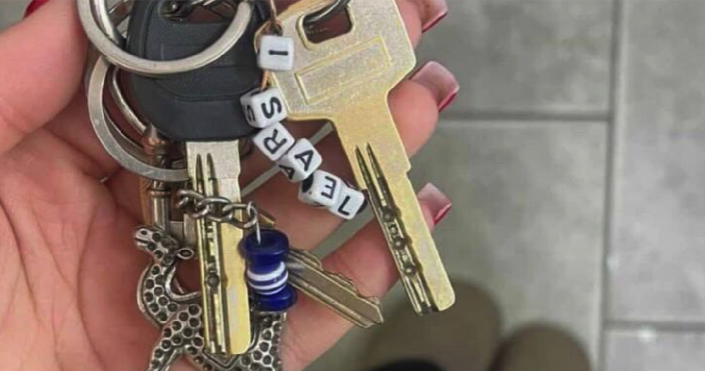 На зв’язці є кілька ключів, автомобільний брелок та металевий брелок у вигляді верблюда та бусин, які утворюють назву карїни Ізраїль.