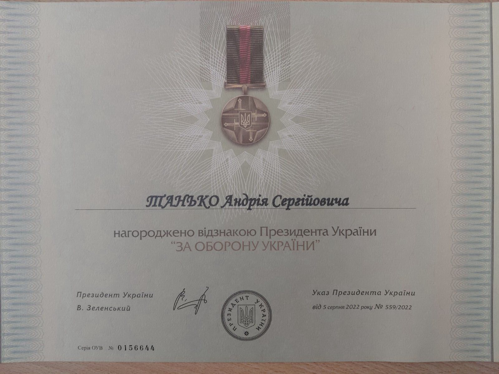 Андрій Танько – захисник України із Сокирянської громади, був удостоєний відзнакою Президента України «За оборону України». Високу нагороду він отримав за значний внесок у захист Батьківщини від російської агресії з перших днів повномасштабного вторгнення.