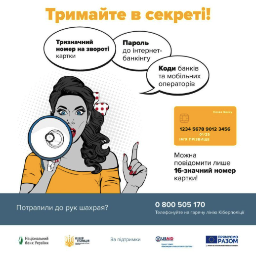 - ніколи й нікому не повідомляйте особисті дані (номер паспорта, індивідуальний податковий номер, паролі і секретні коди до картки та з SMS-повідомлень);