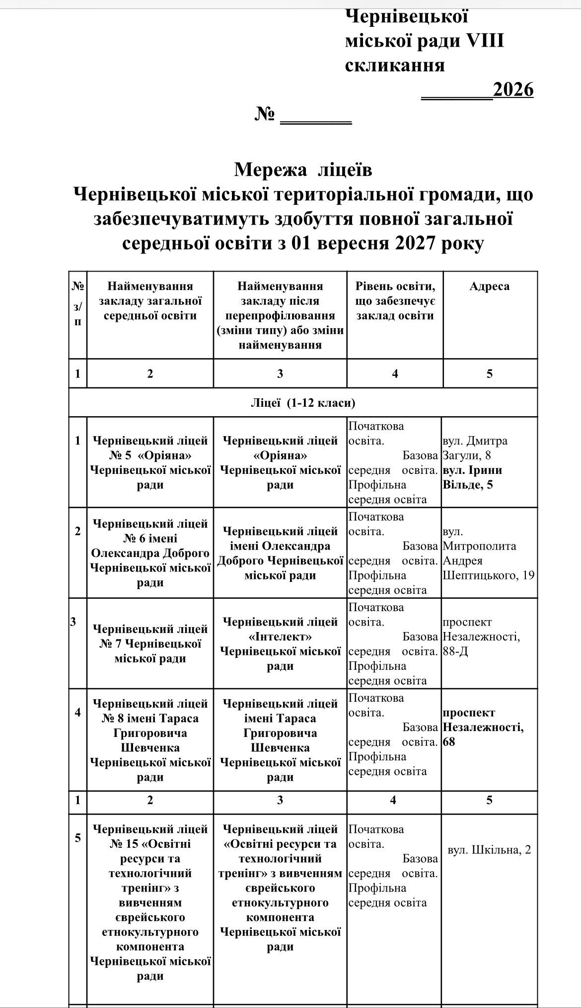 26 лютого на сесії міської ради буде затверджено проєкт рішення «Про затвердження мережі ліцеїв Чернівецької міської територіальної громади, що забезпечуватимуть здобуття повної загальної середньої освіти з 1 вересня 2027 року та перспективного плану трансформації закладів загальної середньої освіти Чернівецької міської територіальної громади».