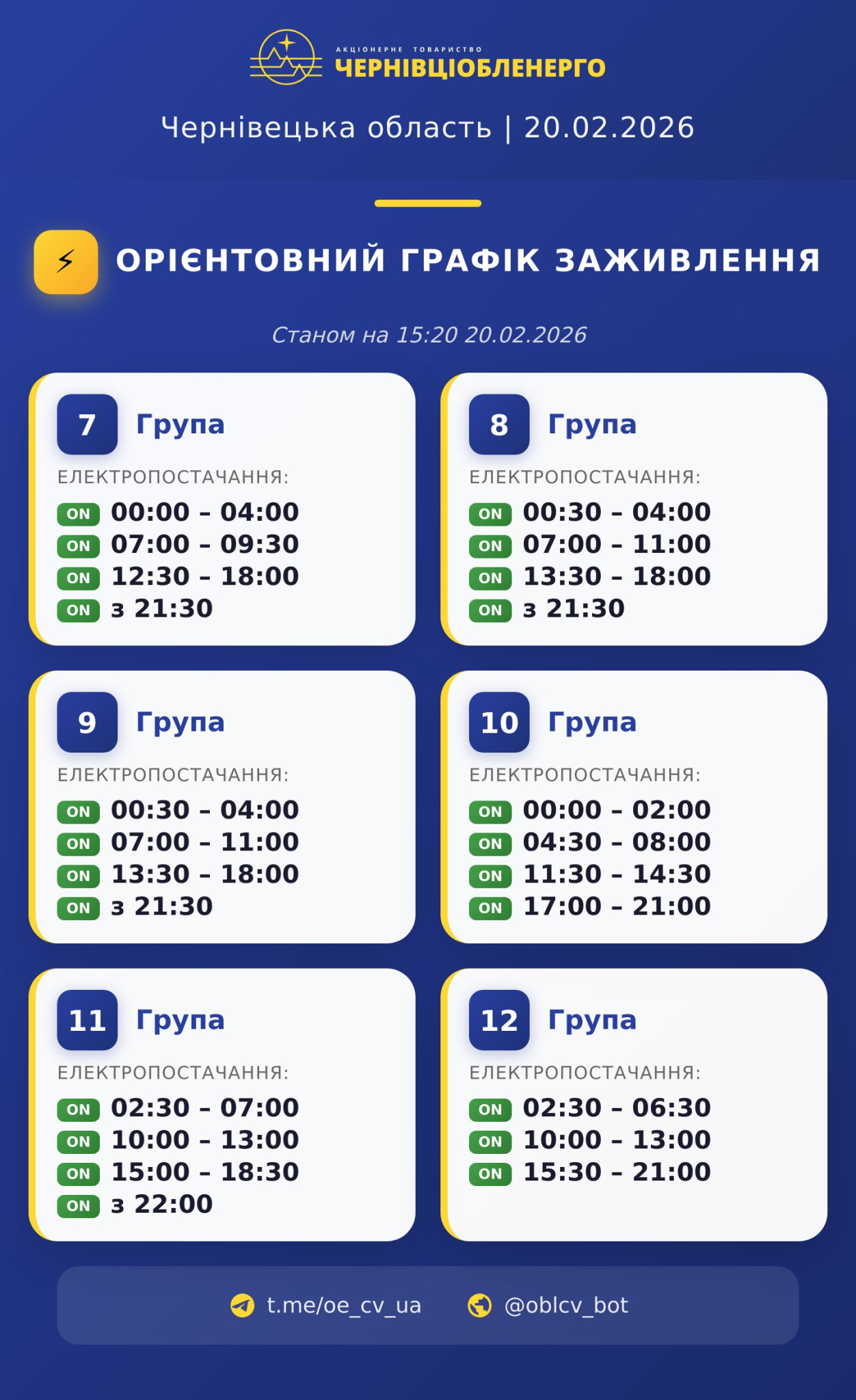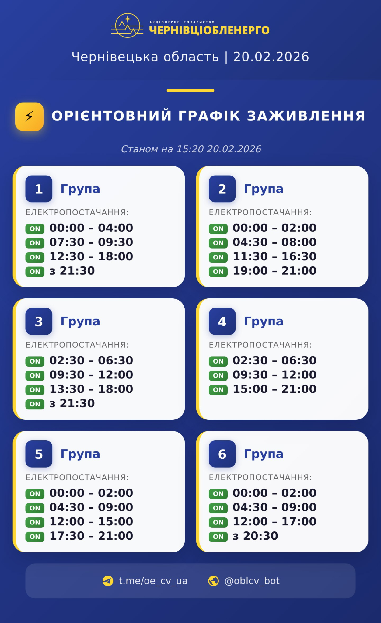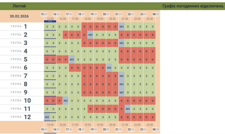 Вчергове оновлений графік вимкнення світла на Буковині 20 лютого.