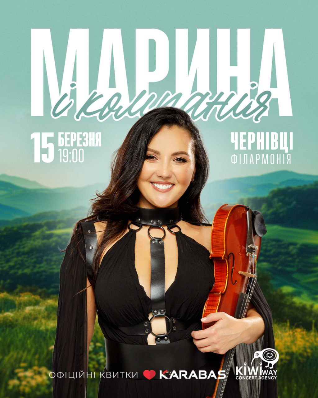 15 березня о 19:00 у залі Чернівецької обласної філармонії відбудеться особлива музична подія — вокально-скрипкове шоу «Марина і компанія. Тільки хіти». У програмі концерту прозвучать улюблені хіти: «Сама п’ю», «Весна», «Ілюзії», «Ти моє диво» та багато інших композицій.