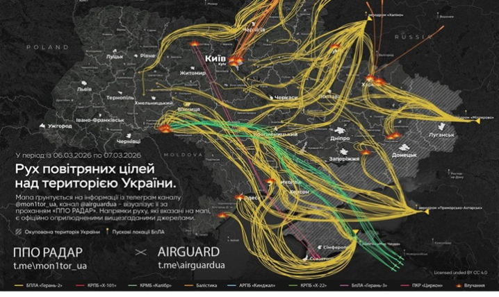 Моніторингові канали опублікували карту руху ракет і «шахедів» під час нічної атаки РФ в =ночі 7 березня.