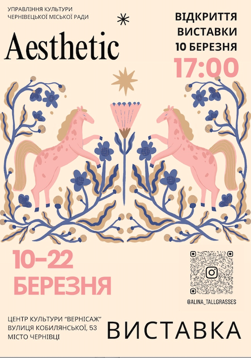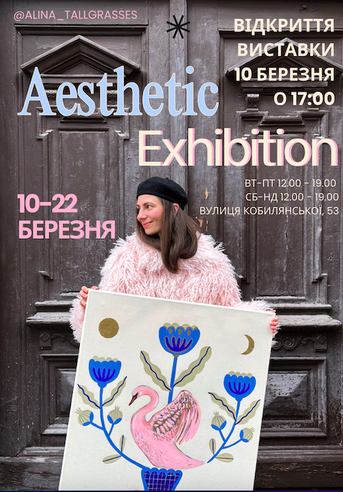 10 березня у мистецькому просторі «Вернісаж» у місті Чернівці відкриється персональна виставка художниці Аліни Макарової «Естетична виставка». Експозиція триватиме до 22 березня, а відкриття відбудеться о 17:00.