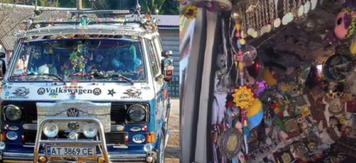 Чоловік причепив у салоні іграшки, наклейки, квіти, ляльки, кнопки, ланцюжки, образки, картинки та прапорці. Також можна побачити декоративні тканини з орнаментами, етнічні елементи, підвіски у вигляді сонця та інші різнокольорові прикраси.