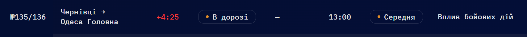 РекламаЧерез масовану російську атаку, на 4 години 25 хвилин затримується потяг Чернівці – Одеса. Про це йдеться на сайті «Укрзалізниці».