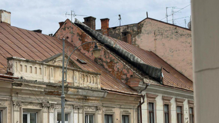 У Чернівцях через сильний порив вітру на будинку по вулиці Головній частково відірвало та погнуло листи металевого покриття даху.