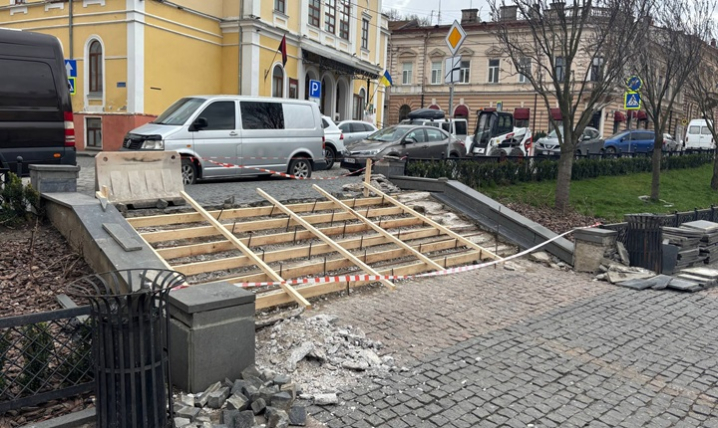 У Чернівцях відновлюють пошкоджені сходи на площі Філармонії. До критичного стану, ймовірно, призвів тривалий термін експлуатації та погодні умови взимку.
