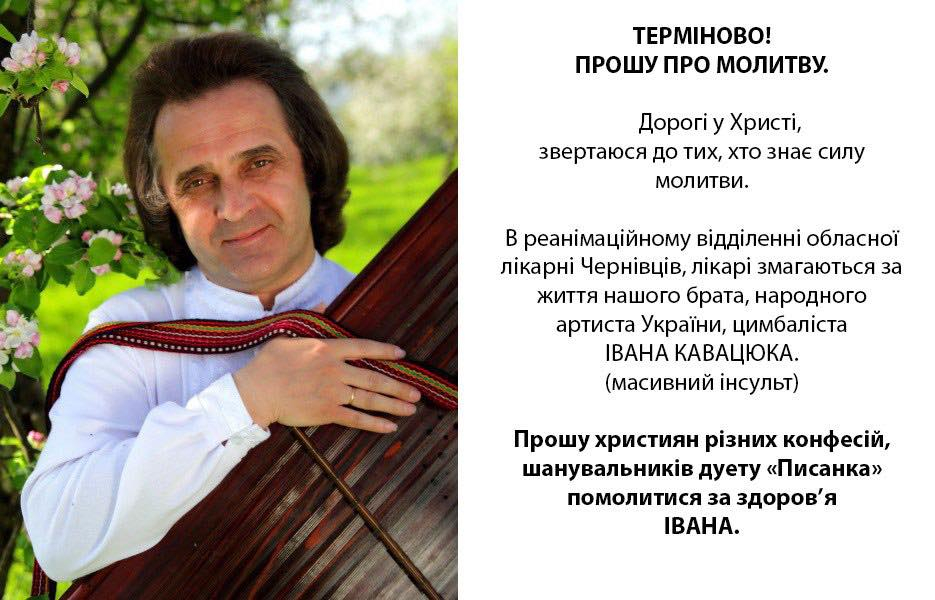 У Чернівцях у реанімаційному відділенні обласної лікарні перебуває народний артист України, цимбаліст і музикант дуету «Писанка» Іван Кавацюк. За інформацією близьких, у нього стався масивний інсульт.